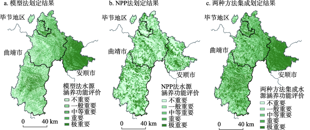Fig. 2 Model method, NPP method and the two-method integrated demarcation result of important area for water conservation function |