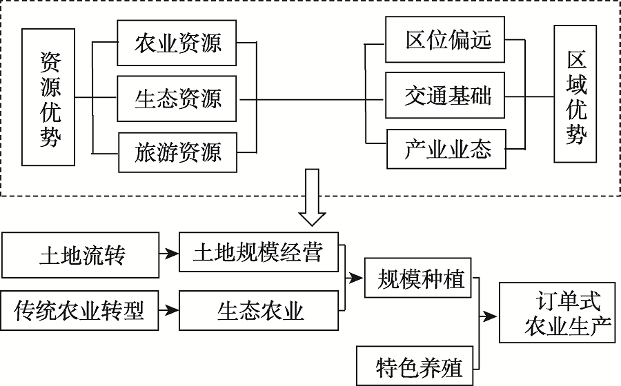 (1)特色生态农业发展模式。该发展模式是以生态农业发展为依托,利用其资源禀赋,走特色化、生态化道路,以规模种植或特色养殖为基础,采用订单式农业生产,创新发展“公司+农户”、“基地+农户”等多种乡镇振兴发展模式(图10)。该模式适合于生态环境良好、污染少、具有特色农业发展基础的地区。典型案例如沽源架豆因土地富硒、无污染、品质高,为当地乡村振兴探寻了一条成功之路。当地以农村土地规模流转助力新型农业生产主体的培育,通过推广“公司+协会+农户”,探索出一条发展订单式农业生产的新模式;围场满族蒙古族自治县姜家店乡利用其资源优势,大力培育高原有机黑木耳,并通过国家有机产品认证,推出“山间24度”有机黑木耳品牌;康保县将好生态变特色,具有绿色养殖优势条件,“康保鸡”大力推动着当地乡村发展。