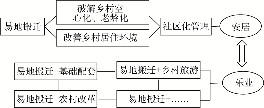 (2)“易地搬迁+”发展模式。易地搬迁工程可破解贫困地区发展难题,通过改善搬迁群众生产生活条件,实现农村生活村镇化,从而破解城乡统筹协调发展的难题。“易地搬迁+”发展模式指通过“易地搬迁+基础配套”、“易地搬迁+乡村旅游”、“易地搬迁+农村改革”等“易地搬迁+”模式,实现农民安居乐业,促进乡村振兴(图11)。该模式适用于生存条件恶劣、生态环境脆弱、自然灾害频发等地区的村庄,或人口流失严重的村庄。典型案例如2017年沽源县高家地村在新址修建136套新民居,室内上下水、燃气灶、有线电视等一应俱全,并配有休闲广场、医疗站等完善的公共服务设施,村民的生产和生活条件得到了明显的改善。