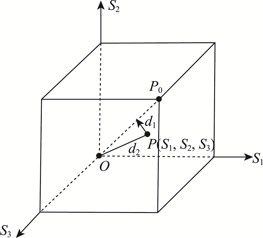 2.3.1 城乡转型指标体系 根据空间解析几何的内涵,如果人口(S1)、土地(S2)、产业(S3)三个子系统对应一个三维空间,则该空间中的任意一点(P)可代表区域系统所处的任一状态(图2)。假若“人-地-业”三个子系统的状态起始点相同(原点O),则对角线OP0(此时S1=S2=S3)表示三个子系统“完全同步发展”,即区域系统处于“完全协调状态”。然而,代表区域系统状态的点P并非恰巧总落在直线OP0上,则点P到直线OP0的距离大小(d1)代表了区域系统偏离完全协调状态的程度,即为“区域系统协调性”;点P到原点O之间的直线距离大小(d2)代表区域综合水平[9,10,11]。两个距离的计算公式如下: