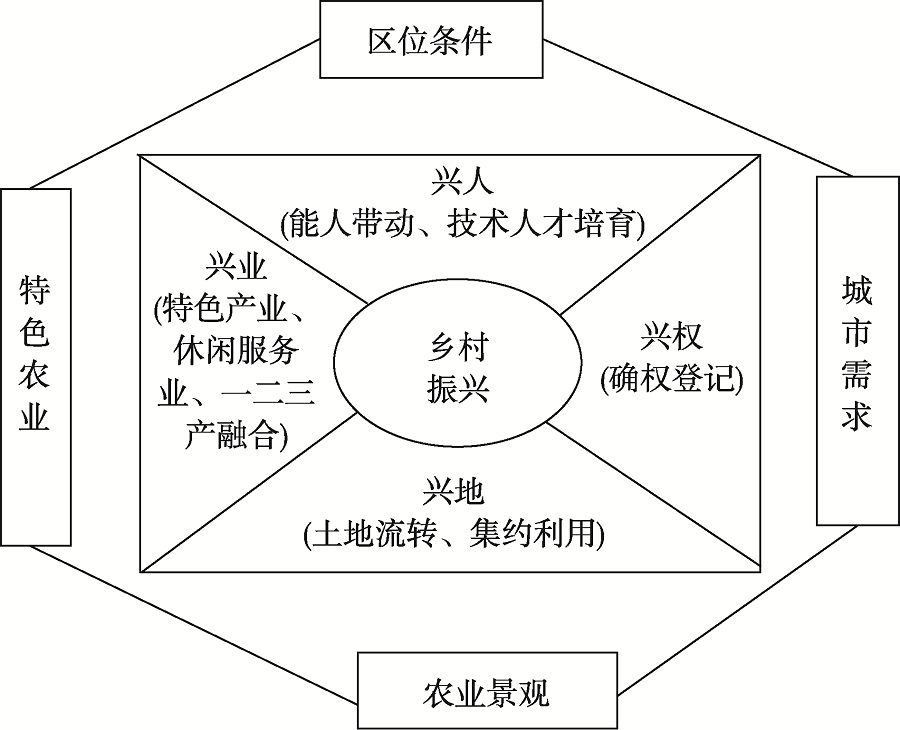 (1)城郊多功能农业发展模式。农业具有多种功能,主要体现在生产、生态、经济、文化、社会等方面[18,19]。城郊多功能农业发展模式是指充分利用农业的多功能性,在大中城市郊区发展观光农业、休闲农业、采摘农业、体验农业等多功能农业,以适应为城市居民享受高质量休闲新体验的需求。该类型是城市发展与农业发展相融合的一种高质高效的现代农业形式,依托的自然与社会环境主要有:① 距离城市中心近,区位优势明显,经济条件较好,基础设施和公共设施较为完善;② 巨大的城市消费市场;③ 良好的生态环境和乡村景观;④ 农业资源丰富且具有地域特色,农业规模化、集约化经营规模高,土地产出率和农民收入也相对较高。该模式旨在利用其区位优势条件,在城市需求的动力下,培育优质特色产业,提供乡村采摘、体验式农业、休闲观光、旅游度假等,在其过程中乡村实现兴人、兴地、兴业、兴权(图5)。城郊多功能农业发展模式由生产型向消费型、服务型转变,表现为观光休闲农业的迅速发展。典型案例如北京市门头沟区孟悟村依托京白梨种植历史和自然地理资源优势,大力发展以京白梨为主导的生态产业和农业经济,并探索出一条特色农村集体经济发展之路[14];天津依托设施农业优势,引进农业龙头企业,在津郊建设优质农产品生产基地,使得当地农特产品直销京冀地区。