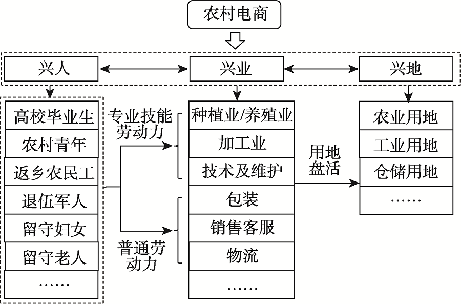(1)农村电商助力模式。农村电商具有草根创业、作坊式生产、同业集聚、协同性等特征[24],以县域电子商务和淘宝村带动形成的农村电商集群,已成为促进乡村经济发展的有效模式[25]。农村电商助力模式是指以电子商务为载体和动力,利用农村资源优势发展乡村适宜产业,通过人岗匹配安置农村剩余劳动力,促进乡村社会经济的转型与发展(即农业的转型、农村的发展、农民的转型),实现乡村振兴(图7)。该模式适用于具有产业特色优势和地区品牌、且配套服务相对完善的乡村地区。这种发展模式主要体现如下:① 培养乡村建设主体,增创就业机会。农村电商日益成为返乡民工、高校毕业生等返乡创业的首选项目[24];② 减小收支差距,促进城乡融合发展;③ 推进农业供给侧结构优化,促进农村产业转型升级。农村电商会带动其配套加工、生产、储藏、物流和服务业的发展,创造符合全面发展原则的新型产业,实现“线上+线下”新零售模式、“实体+网络”带动传统产业升级转型的模式。“淘宝村”为农村经济发展壮大提供了新的思路和途径,典型案例如遵化市东新庄镇西杨庄村是淘宝宠物笼具第一村,2017年底拥有56家宠物笼具销售网店,在淘宝网宠物笼具排名前100名的网店中,80%为本村人经营或外地人经销本村的产品。