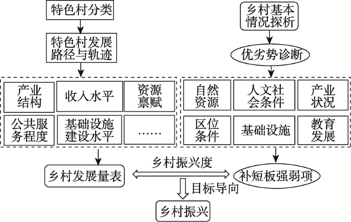 乡村振兴是具有综合性、系统性的“三农”发展问题,涉及地理学、工程学、社会学、管理学、经济学等多学科的理论研究与交叉应用。上述内容基于城乡转型功能分区对适宜各区的模式做了梳理,同时应注意各模式并非适宜于各区的所有村庄,因此针对村域角度则需要进行乡村振兴的路径探究。本文基于乡村发展的相关理论思路,尝试构建乡村振兴发展路径,主要思路如下:针对特色村如产业村、兴旺村、贫困村、空心村等不同类型进行分类,通过分析特色村的产业结构、收入水平、资源禀赋、公共服务程度、基础设施建设水平等自然、社会、经济状况,剖析特色村的发展路径与轨迹,进而采用系列指标构建“乡村发展量表”,作为乡村振兴的参考量表。随后,剖析待研究村庄的基本情况,进行优劣势诊断,分析不同地区的资源要素,以目标为导向,通过与乡村振兴的五大目标对比,进行抓短板、强弱项,通过计算其自身的“乡村振兴度”,明晰村庄所处的状态和振兴潜力,为乡村振兴提供理论基础和定量参考(图12)。并非所有村庄都需要振兴,实施过程中应依靠有活力、有潜力、有资源的村庄,采取小集中、大均衡的模式因地制宜地推动推进乡村振兴[5]。该部分定量研究将会是今后乡村振兴研究的重点和难点。