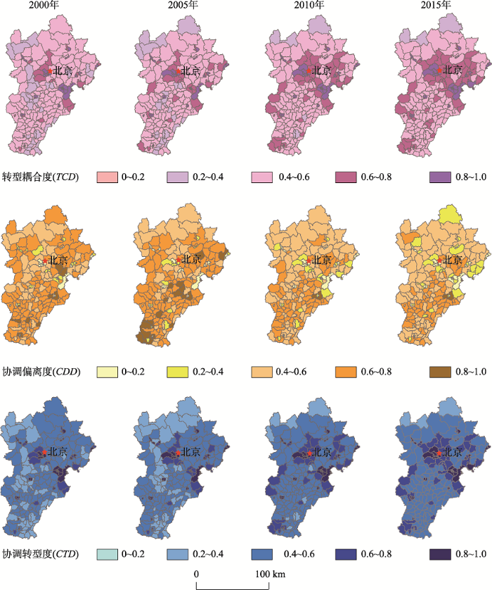 采用等间距法,将转型耦合度(TCD)和协调转型度(CTD)划分为5类来解释京津冀地区千禧年以来的发展差异与空间分异:低水平[0, 0.2)、较低水平[0.2, 0.4)、中等水平[0.4, 0.6)、较高水平[0.6, 0.8)、高水平[0.8, 1];将协调偏离度(CDD)划分为5类:低水平偏离[0,0.05),较低水平偏离[0.05,0.10),中等水平偏离[0.10,0.15),较高水平偏离[0.15,0.20)和高水平偏离(≥0.20)。