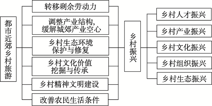 (2)都市近郊乡村旅游拉动模式。都市近郊是城市和乡村的交融地带,同时也是城乡融合发展的核心地区,具有显著的边缘特性[20],产业发展模式为农业、工业、旅游业混合[21, 22],因此,自然环境条件是决定都市近郊区乡村是否可具备旅游发展能力的关键因素。受都市经济条件和文化环境的影响,城市居民对于都市近郊区的乡村旅游有着巨大的需求,这为近郊乡村旅游提供了发展契机和游客来源[23]。都市近郊乡村旅游拉动模式指都市近郊区乡村利用其区位优势和较好的经济环境条件、较为完善的基础设施和公共设施,为城市居民提供消费和乡村景观服务。该模式通过发展乡村旅游,转移乡村剩余劳动力,同时在发展乡村旅游特色中进行生态环境保护与修复、乡村文化价值挖掘与传承,改善居民生产、生活条件,实现乡村振兴(图6)。典型案例如北京市昌平区流村镇是距离北京最近的山镇,交通便利,区位优越,地形地貌丰富,自然和人文资源多样,因此近年来乡村旅游蓬勃发展。