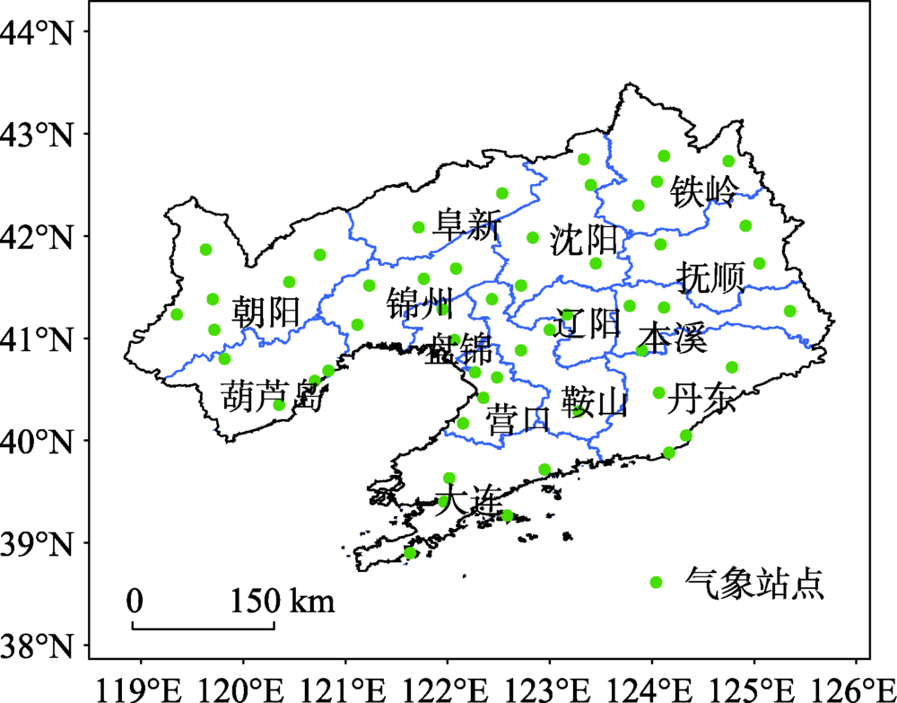 本文使用的资料为辽宁省52个气象观测站逐日平均数据集,时间长度为1961—2014年,气象要素包括日平均气温、平均风速、最低气温、最高气温、降水量、日照时数及平均水汽压共7个观测要素(气象站空间分布见图1 )。在54年中,共有26年存在缺测,其中在2011年站点缺测数最多,共有10个站点存在数据缺测,其他大多数年份存在1个站点数据缺测。数据缺测的处理方法:一个月中日值存在≥7天缺测,即认为该月值为缺测;一年中存在≥1月缺测,即认为该年值缺测。对缺测的月、年值采取剔除的处理方法。