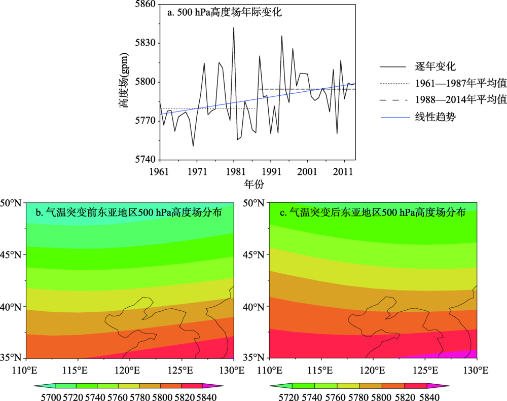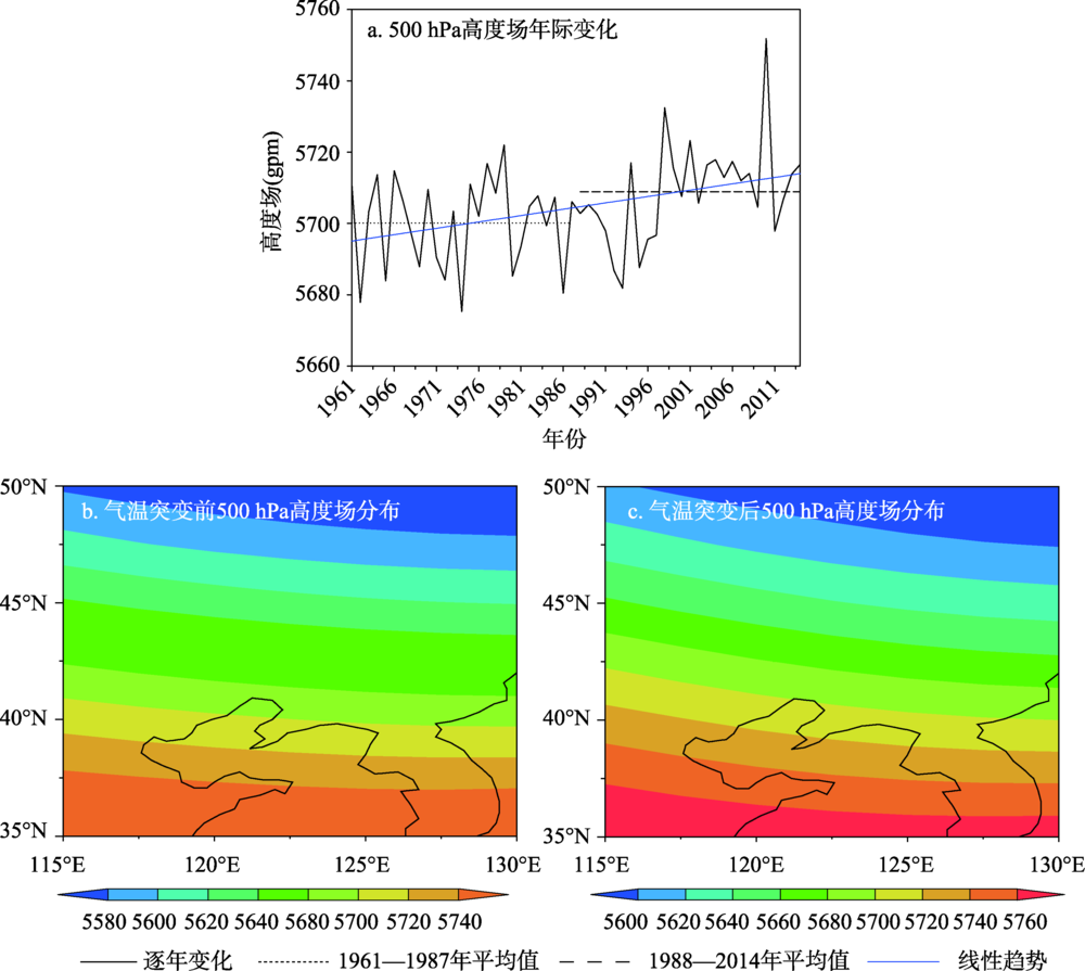 Fig. 7 Annual changes of 500 hPa height field during the days with daily accumulated temperature above 10 ℃ from 1961 to 2014, the distribution of 500 hPa height field over East Asia 1961-1987 and 1988-2014