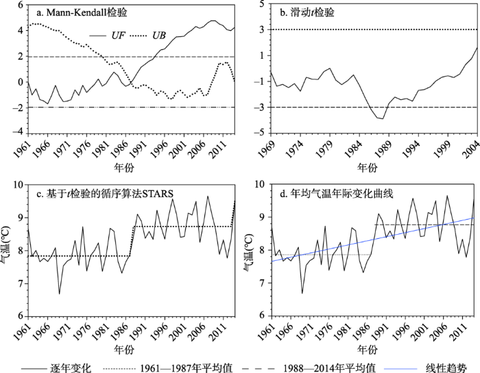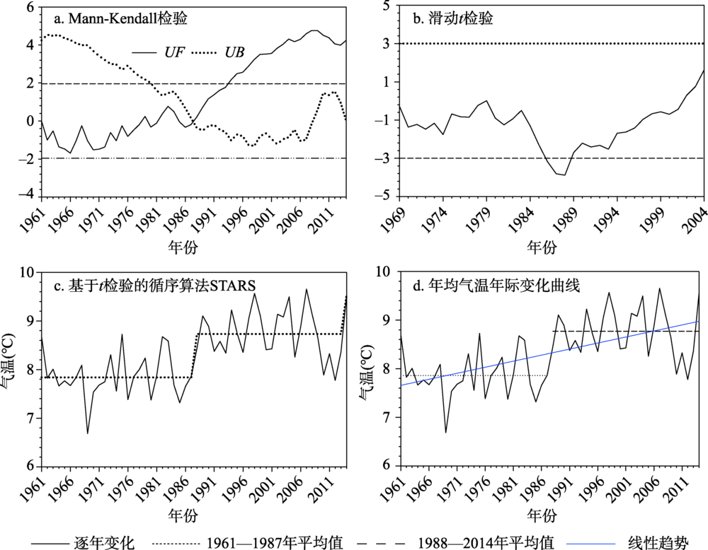 在确定某气候系统或过程发生突变现象时,最好使用多种突变方法进行比较,以确保突变稳定性。利用Mann-Kendall、滑动t检验[17 ] 以及基于t 检验的循序算法STARS[18 ,19 ] 对1961—2014年辽宁省平均年气温进行突变检测(图2 a~图2 c),结果发现三种突变检测方法一致表明辽宁省气温在1988年发生一次突变,1961—1987年平均气温为7.9 ℃,1988—2014年为8.8 ℃,通过了0.05信度显著性检验。在1988年之后,辽宁省气温显著变暖,年均气温呈缓慢上升趋势,升幅为0.3 ℃/10年(图2 d)。