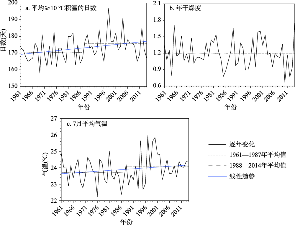 图3 1961—2014年辽宁省平均≥10 ℃积温日数、年干燥度、7月平均气温