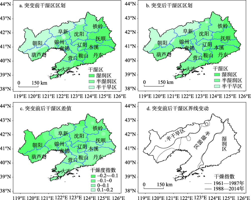 3.3.2 干湿区及其界线变化 根据干湿区划分指标及其标准(表2 ),划分突变前后辽宁省干湿区分布状况。可以发现在1988年之前(图5 a),半干旱区主要分布在朝阳市、阜新市、葫芦岛市北部、锦州市西部、沈阳市北部地区;半湿润区主要分布在葫芦岛市中南部、锦州市中东部、沈阳市中南部、盘锦市、营口市、大连市中西部、鞍山市中北部、辽阳市西部、铁岭市中西部等地区;湿润区主要分布在辽宁省半湿润区以东地区。1988年之后(图5 b),半湿润区显著向西向北扩展,已经覆盖葫芦岛市全境、锦州市大部、沈阳市几乎全境、朝阳市南部地区。对突变前后干燥度进行差值特征分析发现:突变后以盘锦南部-鞍山中部-辽阳南部-本溪西北部-抚顺为界线,该界线以北以西地区(除了阜新地区以及个别地区外)干燥度指数减小,表明该区域气候向湿润趋势发展,其中沈阳北部、朝阳中西部以及葫芦岛西北部趋势更加明显,干燥度减幅在0.1~0.2之间;在界线以南大部地区干燥度呈现增加趋势,表明该区域气候向干燥趋势发展(图5 c)。但通过显著性t检验表明仅有2个站(康平县和营口市)的干燥指数通过0.05信度检验,其他59站干燥指并没有通过显著性检验,说明该区域干燥指数对气温突变响应并不显著。图5 d给出各区边界变动情况,可以看出半湿润-半干旱区的边界位置出现较显著的变动,半湿润区(半干旱区)的范围主要向西向北扩展(收缩),界线经度平均由121.5°E到121.2°E,幅度约为0.3°,纬度平均由41.4°N到41.6°N,幅度约为0.2°,而半湿润-湿润区边界位置变化不显著。