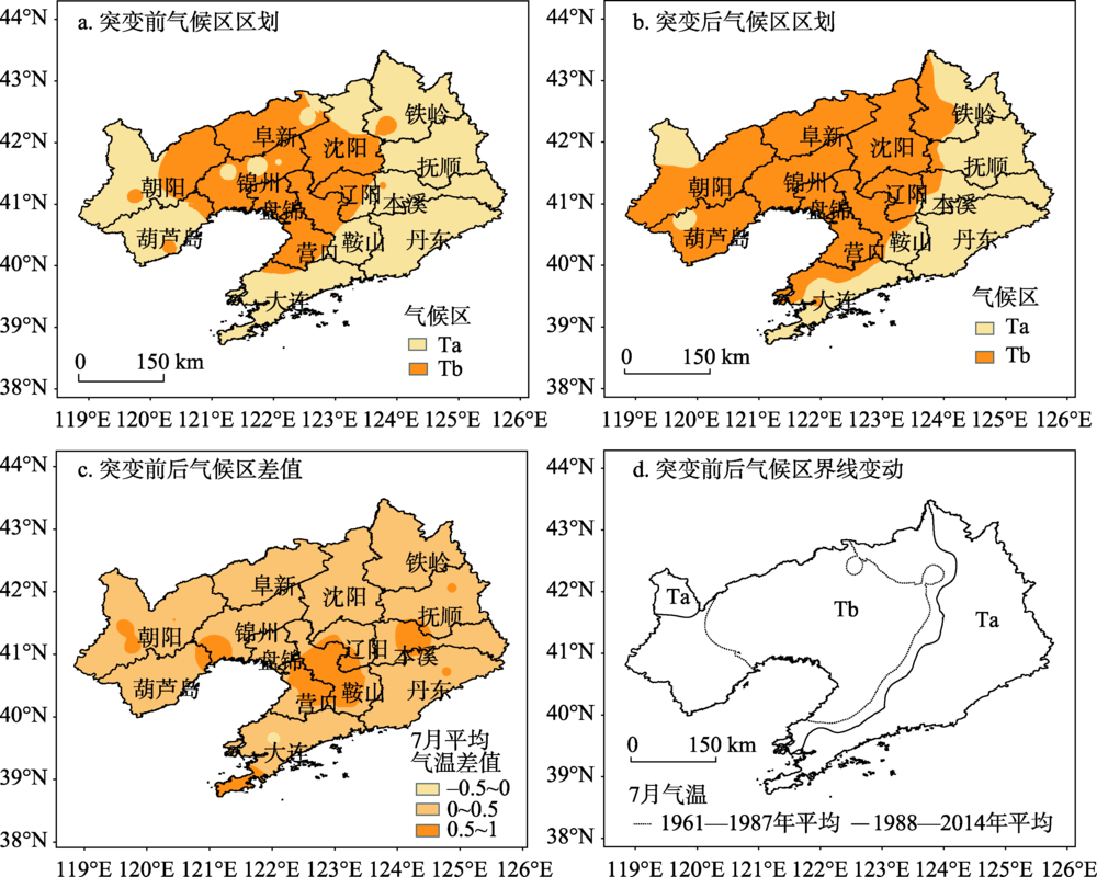 3.3.3 气候区及其界线变化 根据气候区划分指标及其标准(表3 ),划分突变前后气候区分布状况。在气温突变前(图6 a)气候区Tb主要分布在辽宁省中西部地区,包括朝阳中东部、葫芦岛东北部、锦州大部、阜新中西部、沈阳中南部、铁岭西南部、辽阳中西部、鞍山中北部、盘锦、营口大部以及大连北部。在突变后(图6 b),气候区Tb向西扩展到朝阳、葫芦岛西部,向南扩展到大连中部,向东扩展到本溪、抚顺、铁岭西部、向北扩展到沈阳北部。对突变前后七月平均气温进行差值特征分析发现(图6 c):辽宁省大部地区七月平均温度增幅为0~0.5 ℃,其中朝阳中西部、葫芦岛东部、锦州西南部、本溪西部、大连南部以及辽阳、鞍山、营口部分地区增幅达到0.5~1 ℃,可以看出在突变后全省七月平均气温呈上升趋势。显著性t检验表明:只有台安、锦州、盘山等共12站通过了0.05信度检验,其余40站没有通过检验。图6 d给出气候区边界变动特征,可以看出,气候区Tb明显向四周扩展,气候区Ta显著向东向北收缩,其中西部边界显著向西向北移动,经度平均由120.5°E到119.8°E,幅度约为0.7°,纬度平均由41.3°N到41.7°N,幅度约为0.4°,东部边界主要向东移动,平均由123.0°E到123.3°E,幅度约为0.3°。