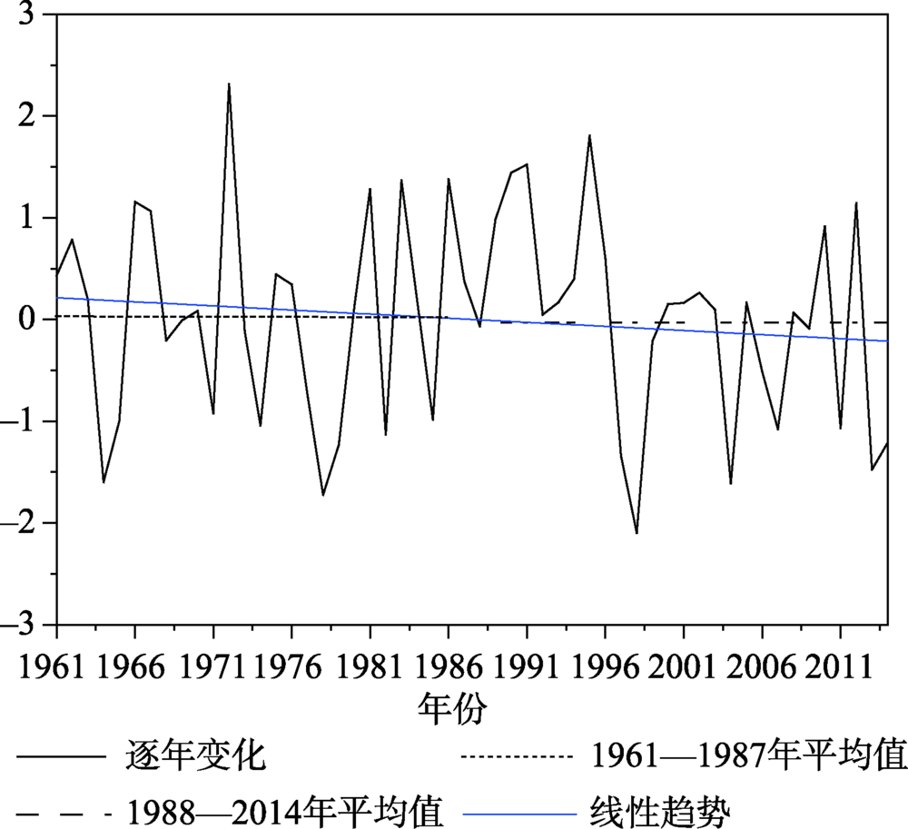 4月和10月是辽宁省平均气温通过10 ℃的临界月份,其气温高低将对全年≥10 ℃日数变化产生重要影响,而西伯利亚高压和北极涛动(AO)是影响辽宁省气温变化主要系统,因此本文计算东亚冬季风强度指数[21 ] 、西伯利亚高压强度[22 ] 和AO指数表征高纬和极地的冷空气活动强度。一般来说,西伯利亚高压越强,辽宁省气温易偏低,≥10 ℃积温日数偏少,反之亦然。AO指数偏高,中高纬大气呈纬向环流形势,不利于冷空气南下,有利于辽宁省气温偏高,≥10 ℃积温日数偏多,反之亦然。通过计算发现西伯利亚高压和AO指数变化趋势并不明显,无法解释突变年前后≥10 ℃积温日数变化特征(图略),但东亚冬季风强度呈缓慢下降趋势,为-0.1/10年,1961—1987年平均为0.03,1988—2014年为-0.03(图8 ),突变年后东亚冬季风减弱有利于气温偏高,≥10 ℃积温日数增加,但通过东亚冬季风强度与≥10 ℃积温日数相关分析发现,两者不存在明显的相关关系,没有通过显著性检验,考虑到东亚冬季风的强度对4月和10月≥10℃气温具有较大影响,故仍然讨论之。