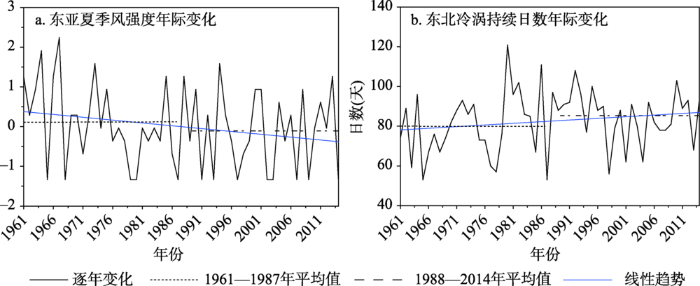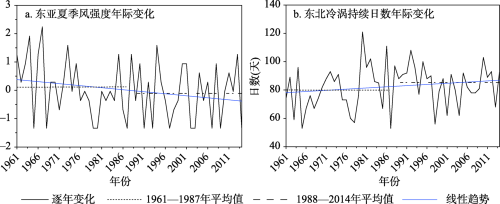 Fig. 9 Intetrannual changes of East Asian summer monsoon intensity, and Northeast cold vortex lasting days from April to October, 1961 to 2014