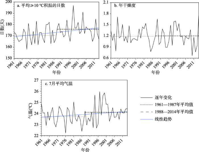 根据辽宁省气温突变时间节点,分析突变前后区划指标值的变化特征。可以看出,辽宁省≥10 ℃积温平均日数呈缓慢上升趋势,增幅为1.5天/10年。1961—1987年≥10 ℃平均积温日数为170.4天,1988—2014年平均为175.9天,并且通过了0.05的显著性检验,表明突变后≥10 ℃积温日数显著增加(图3 a)。而平均干燥度年际变化趋势并不明显,1961—1987年平均干燥指数为1.19,1988—2014年为1.2,没有通过显著性检验(图3 b),表明突变前后干燥指数变化不明显(图3 b)。七月平均气温呈缓慢上升趋势,增幅在0.1 ℃/10年,1961—1987年平均为23.7 ℃,1988—2014年平均为24.1 ℃,但没有通过显著性检验,表明突变前后干燥指数变化不明显(图3 c)。