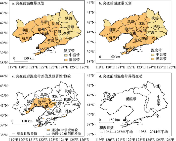 图4 1961—2014年突变前后辽宁省温度带区划、差值显著性t 检验以及温度带界线变动