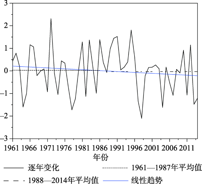 ... 本文按照廉毅等定义的东亚夏季风指数[24 ,25 ] ,该指数与辽宁省空间降水量具有很高的正相关关系(大部分地区通过了0.05的信度检验),可以作为指示辽宁省降水强度的指标.1961—2014年东亚夏季风强度呈缓慢减弱趋势,升幅为-0.1/10年.就平均而言,突变前(突变后)东亚夏季风强度为0.11(-0.11),并通过了0.001的信度检验(图9 a).因此自1988年以来,东亚夏季风指数进入一个较弱时期,不利于辽宁降水量增加,有利于干燥指数增加,从而有利于湿润区或半湿润区的面积减小,半干旱区面积增加.根据胡开喜[26 ] 对东北冷涡客观识别计算定义,利用fortran程序客观识别出1956—1990年历年东北冷涡持续出现天数,并与孙力等的结果[27 ] 进行比较,发现相关系数到达0.38,通过了0.05信度检验,可以认为本文的客观识别结果是可信的.1961—2014年4—10月东北冷涡持续天数与其期间辽宁降水量相关分析表明两者存在显著地正相关关系,相关系数达到0.99,通过了0.01的信度检验.东北冷涡持续天数变化呈缓慢增加趋势,升幅为1.7天/10年,在突变年之前(之后),东北冷涡平均持续天数为79.8天(85.3天),但没有通过显著性检验(图9 b),可以认为突变年后东北冷涡发生天数呈缓慢上升趋势,有利于辽宁省降水增加,干燥指数减小,半湿润区的面积增加,半干旱区面积减少. ...