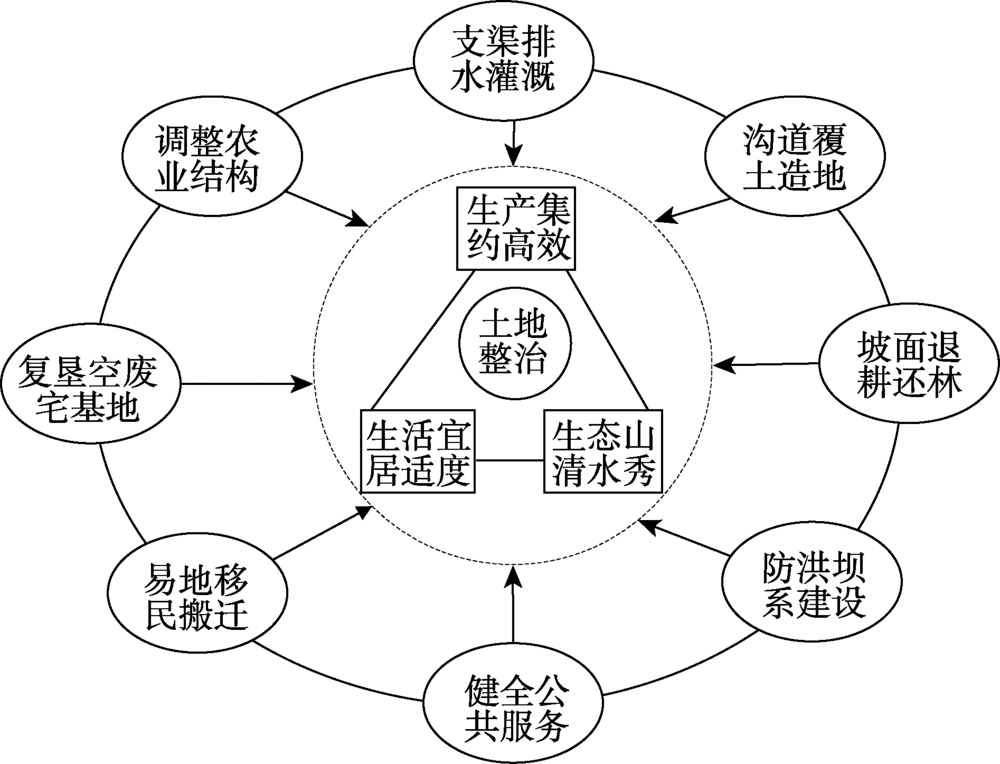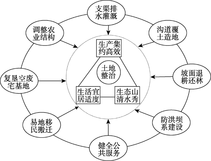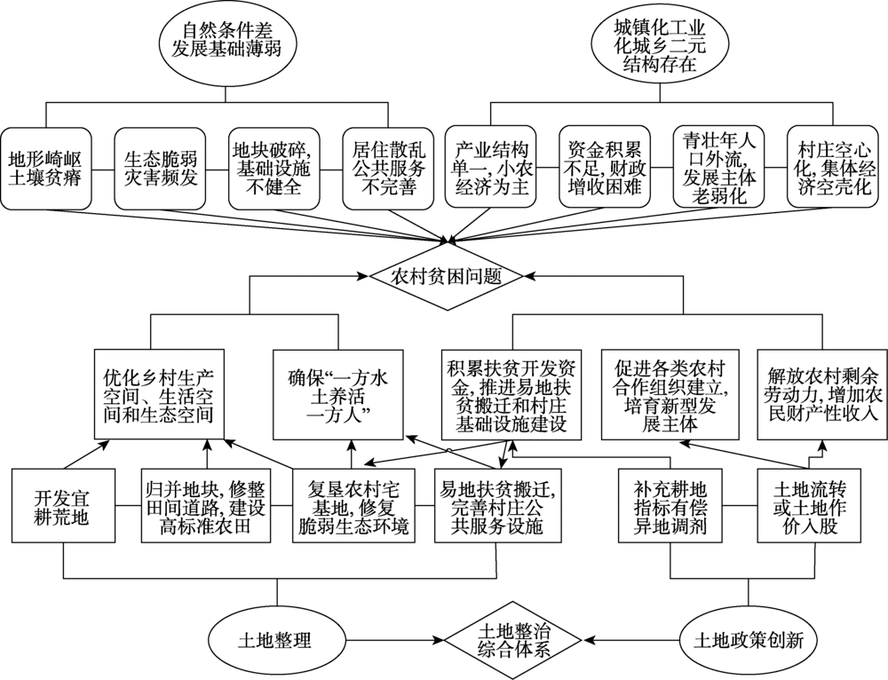 中国广大农村贫困地区普遍面临着土地利用粗放、农业生产资料投入不足、农村土地流转困难、公共基础设施配置不足等一系列乡村衰退问题[15 ] 。土地资源匮乏,利用效率低,成为制约贫困地区经济社会发展的主要瓶颈之一。据统计,全国14个集中连片特困区缓陡坡、陡坡面积比例分别为20.8%和17.1%,受土地资源约束的国家级贫困县占24.96%[16 ] 。贫困人口大多分布在中西部的深石山区、高寒区、生态脆弱区、灾害频发区和生态保护区,自然条件差,基础设施薄弱,产业发展滞后,农民增收困难[17 ] 。土地整治作为适时补充耕地、盘活存量土地、优化城乡用地、强化集约用地、提升土地产能的重要途径[18 ,19 ] ,对推进区域减贫发展,实现乡村振兴具有积极作用。土地整治本质上是对人地关系的再调试[20 ] ,其首要功能是增加贫困地区的土地资源禀赋,为扩大生产创造条件,从而增加农民的生产性收入;同时,通过与土地制度、政策创新相结合,将市场机制和资本运作方式引入农村,促进土地、劳力、技术、资金等多元要素的整合与重构,增加农民的财产性收入,进而实现农村生产集约、生活提质、生态改善的三生目标[21 ,22 ] 。