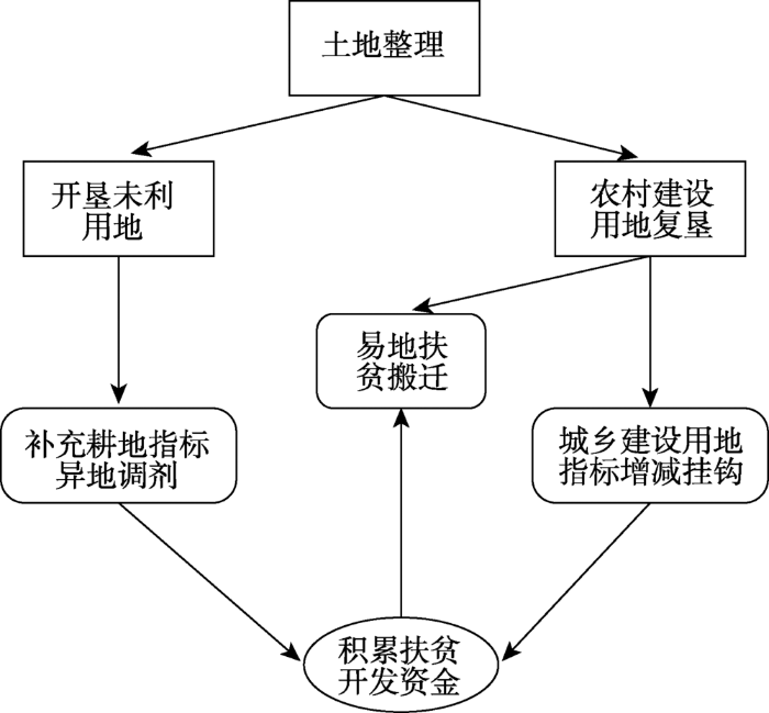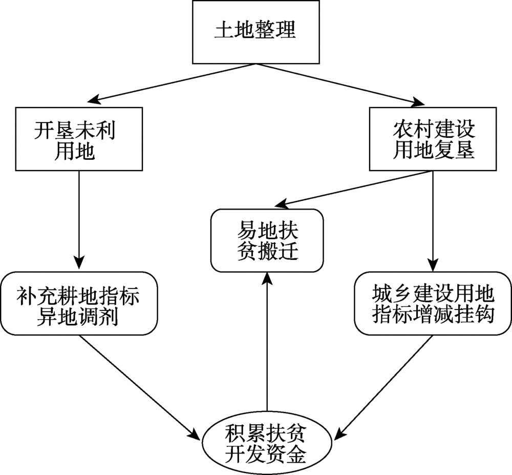 伴随着工业化和城市化的快速推进,城市建设加速蔓延,用地需求不断扩大,加之耕地保护的压力,城市建设用地供给日趋紧张。在此背景下,旨在盘活城乡存量土地,缓解建设用地供需矛盾的城乡建设用地增减挂钩政策应运而生。2016年,为充分发挥城乡建设用地增减挂钩政策在扶贫开发中的积极作用,国土资源部出台文件,允许贫困地区将增减挂钩节余指标在省域范围流转,积极推进扶贫开发和易地扶贫搬迁。补充耕地指标异地调剂,实质上是土地发展权在城乡间的交易和配置,实现了土地和资金在城乡间的双向流动,既能积累扶贫开发资金,又有利于推进城乡协调发展(图3 )。