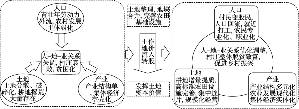 扶贫开发中的土地整治工程不仅涵盖以往国土开发与整治的概念范畴,而且关注与土地整治相关的社会经济关系的调整[31 ] ,将土地整理与土地政策创新、机制变革相结合,促进农村人力、资本、土地等多元要素整合,加速农村转型发展和乡村振兴。土地政策对可持续增长、良好治理及城乡居民的生活福利及获取经济机会至关重要,土地问题上任何微小的改善都会显著影响穷人[32 ] ,开展土地整治的同时用活土地政策,才能充分发挥土地整治促进经济增长,消除贫困的作用。在贫困地区开展土地整治的过程中,一方面将土地整治与城乡建设用地增减挂钩相结合,通过补充耕地指标异地调剂,为农村地区积累扶贫开发资金,解决贫困地区发展资金短缺的问题。另一方面,在土地整治的基础上,鼓励实施土地使用权流转或作价入股,将土地集中到更具备生产能力的农民手中,解放农村剩余劳动力,实现土地要素与其他生产要素的合理匹配,提高土地利用效率,破解区域发展中的人、地、资本等要素配置的结构性矛盾,满足区域协调发展的多元目标需求[33 ] 。土地流转为农村专业合作组织及龙头企业的发展创造了条件,带动了农村地区产业结构的升级[34 ] ,同时吸引部分农村青壮年劳动力回乡创业,缓解农村空心化,有利于培育贫困地区的农村新型发展主体,激发农村内生发展动力。更有一些贫困地区通过空心村整治,实施组织整合、产业整合和空间整合,调整不合理的土地利用和空间组织关系,促进了村庄居住集中化、产业集聚化、基层组织社区化,加快了新农村建设和乡村转型发展。