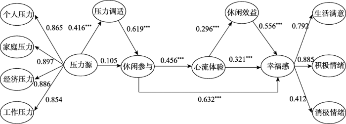 第一,压力源是压力调适的重要影响因素,家庭压力对压力源的影响最大,其次是经济压力、个人压力和工作压力。从结构模型可以看出,积极情绪显著高于消极情绪,由此得出通过休闲活动可以获得更多的幸福感。第二,压力调适显著正向影响休闲参与,压力源对休闲参与影响不显著,但将样本进行分类分别进行回归时,却得出不同的结果,出现正负显著相关两种情况。不同背景条件变项的城市居民旅游者在压力调适、休闲参与和幸福感具有显著的差异。第三,休闲参与正向显著影响心流体验和幸福感,休闲效益对幸福感亦具有正向显著影响,心流体验和休闲效益分别在休闲参与和心流体验对幸福感的影响过程中扮演着部分中介角色。心流体验正向显著影响休闲效益和幸福感,且心流体验在休闲参与对幸福感具有部分中介作用。