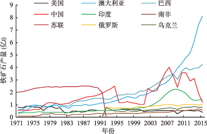 总体上,世界铁矿石的产量呈增长趋势,1971—2015年间累积增加了1.57倍,从地理上观察可以发现具有如下规律: