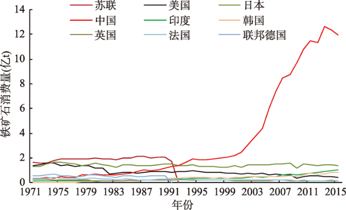 世界铁矿石的消费量没有直接的统计数据,但由于绝大部分铁矿石主要用于生铁生产,因而可以利用生铁的统计数据经过指标换算后间接得到铁矿石的消费量[19]。统计的结果表明,1971—2000年世界铁矿石的消费量呈波动增长,30年间增加了1.79亿t,年均增长0.69%,变化幅度不大。2000年之后世界铁矿石的消费量急剧增加,从9.3亿t上升到2015年的20.06亿t,年均增长5.64%。按地区考量,亚洲铁矿石消费量的增长对世界的影响最大,仅进入本世纪的15年间便增长了10.86亿t,年均增长8.87%。相比之下,南美洲铁矿石的消费量一直处于1亿t以下的量级,其中消费量较大的国家为巴西。欧洲和北美洲由于实施了严格的环保措施,对冶炼业进行了一系列结构调整,致使铁矿石的需求分别从4.02亿t、1.58亿t降至3.12亿t、0.62亿t,呈萎缩状态,钢铁行业接近退出。大洋洲和非洲的铁矿石消费量在0.1亿t左右波动,在量级上基本上可以忽略。