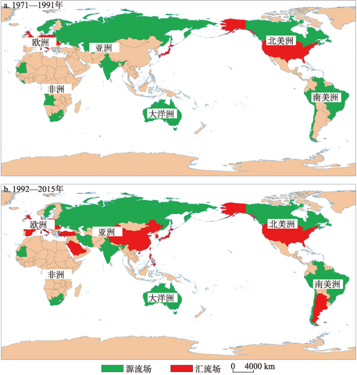 借助“场”的概念,可将北美、南美、欧、非、亚以及大洋洲划为铁矿石流场(图4),其中,北美为源流场,以加拿大为源向中、日、韩等东亚国家和西欧部分国家输出铁矿石;由巴西、委内瑞拉、智利和秘鲁等南美国家组成源流场;由德、英、荷、法、意等欧洲国家构成汇流场,其铁矿石主要来自南美的巴西和北美的加拿大;由毛里塔尼亚、利比里亚和南非等非洲国家构成源流场。1991年后,世界流场分布发生了较大变化。例如,中国、韩国、中国台湾、西班牙、沙特阿拉伯和阿根廷等国对铁矿石的输入量急剧增加,形成了新的铁矿石汇流场;伊朗因其输出量大幅增加,形成了新的源流场;苏联解体后的俄罗斯、乌克兰和哈萨克斯坦承接其资源优势,继续成为铁矿石源流场;利比里亚和安哥拉的铁矿石输出量大幅下降,逐渐退出了铁矿石流场的源-汇系统。
