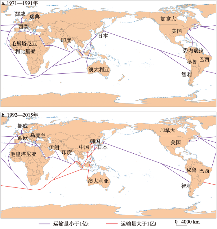 全球铁矿石流动的迹线是铁矿石运输通道构成的流动网络,流动的主要方式为海上运输,而通过铁路运输的运量较少[21]。随着世界铁矿石“源”与“汇”的规模不断加大,致使海上运输量急剧增加,形成了北美东海岸—远东、北美东海岸—西欧、南美—东亚、南美东—西欧、澳大利亚西岸—东亚、西非—东亚以及南亚—东亚等船舶往来十分繁忙的重要航线。随着世界铁矿石供需格局的演变,一些航线如南美东海岸—北美东海岸、澳大利亚—西欧和西非—西欧航线的地位明显下降。同时,以东亚为目的地的航线由日本变为了中国、日本和韩国(图5)。