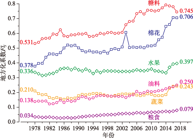 图2 1978—2017年中国主要农产品的地方化系数FIj