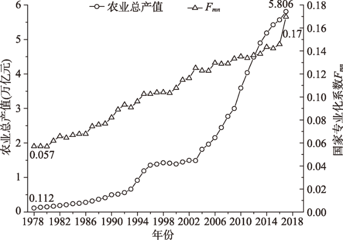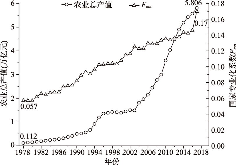 图3 1978—2017年中国农业总产值及国家专业化系数Fmn