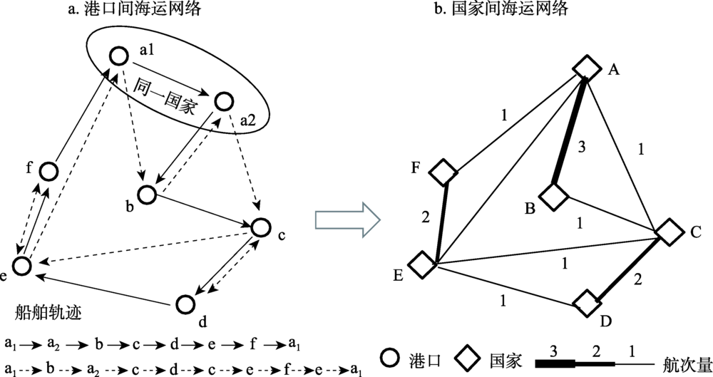 | 图2 网络模型构建 注:A、B、C、D、E、F代表不同的国家;a 1、a 2、b、c、d、e、f表示对应国家的港口。 |