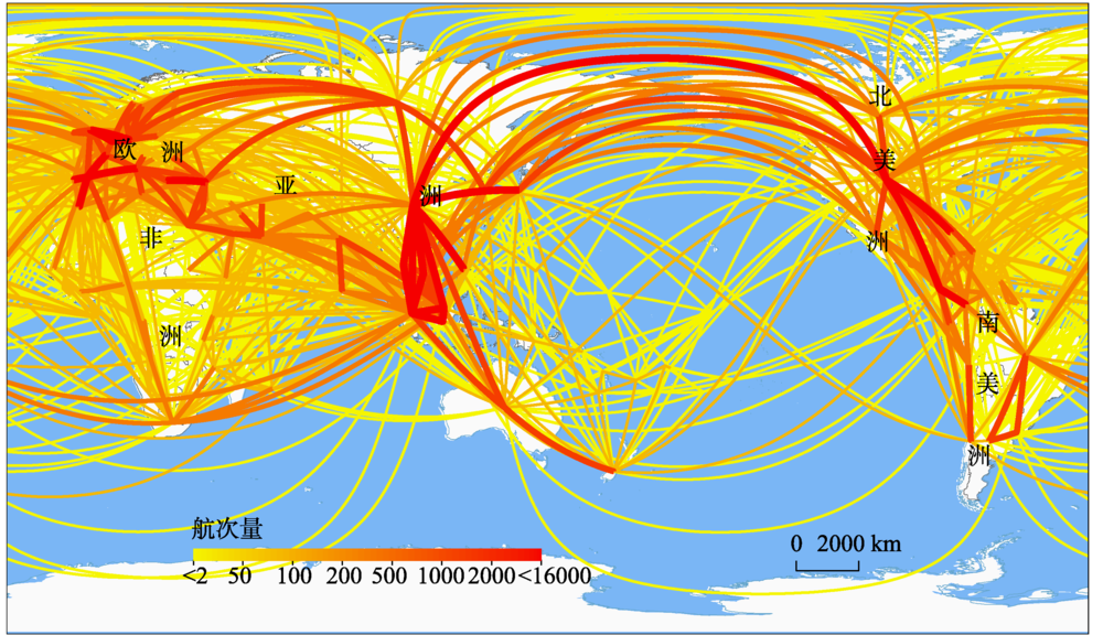 | 图5 海运国家间集装箱航运流空间分布格局 注:该图基于国家测绘地理信息局标准地图(审图号:GS(2016)1667)绘制,底图无修改。 |