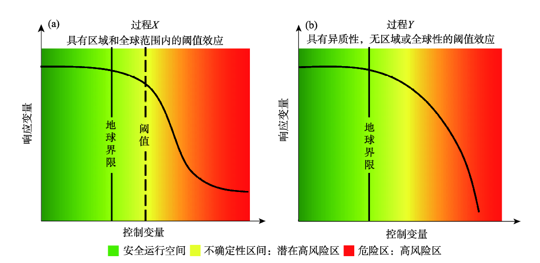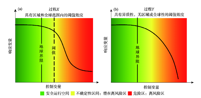 “地球界限”是用于界定 “安全运行空间”的边界值,而“安全运行空间”则是指人类活动的合理范围或程度(Rockström et al, 2009b)。该概念框架旨在避免全球范围内剧烈的人为环境变化,降低人类活动超出地球系统生态阈值的风险,从而维持地球当前与全新世环境条件相近的状态,以保障人类的生存(Rockström et al, 2009b; Steffen et al, 2015)。“地球界限”是基于预防性原则提出的,并以某种地球系统过程的生态阈值为参考。然而,由于当前已有的知识无法详细描述自然过程的复杂性,或者是控制变量和响应变量之间相互作用的反馈机制,使得评估到的生态阈值具有一定的不确定性,因此常以生态阈值不确定性范围内的最小值来设定地球界限(Rockström et al, 2009b; Steffen et al, 2015);但是,对于不具有区域或全球性阈值效应的地球系统过程来说,其地球界限的界定则可以以某一时期的环境特征为参考(例如全新世),并且结合人们的发展需求和对环境风险的感知来设定(Rockström et al, 2009b)。由此可以看出,无论是生态阈值,还是人们对环境风险的感知,两者不确定性的范围均对“地球界限”的界定有重要的影响。由图1所示,在“地球界限”左侧的绿色范围即表征某种过程或控制变量的“安全运行空间”,超过边界值以后会进入一段潜在的高风险区,一旦进入红色范围就意味着超过了生态阈值,并将引发不可逆的环境退化的现象。