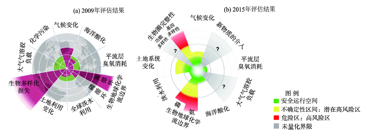 Rockström 等(2009a)曾评估了9种关键的地球系统过程,包括气候变化(climate change)、海洋酸化(ocean acidification)、平流层臭氧消耗(stratospheric ozone depletion)、氮磷循环(nitrogen、phosphorus cycle)、全球淡水使用(global freshwater use)、土地利用变化(change in land use)、生物多样性损失(biodiversity loss)、大气气溶胶负载(atmospheric aerosol loading)和化学污染(chemical pollution)。其研究表明,气候变化、生物多样性损失和氮循环已经超过了地球界限,同时也指出由于受到数据资料的限制,并未量化化学污染和大气气溶胶负载的变化状况(图2a)(Rockström et al, 2009a)。