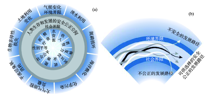图3 人类生存和发展的安全公正空间的概念框架(a)及其潜在的发展路径(b)(
