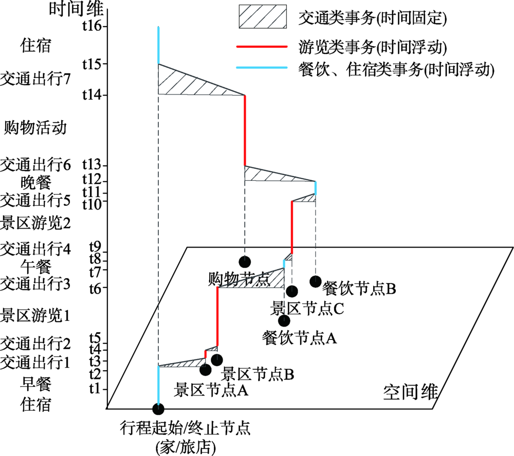随着中国自助旅游市场规模的快速扩张,传统旅游线路设计思路难以满足游客自身的灵活需求以及线路设计的时空统一性,这就要求旅游服务部门能够提供更为便捷、合理、灵活的行程规划方案。为了应对游客对游览目的地了解不足,以及对实际景点游玩时间与游览顺序认知上的模糊[1 ,2 ,3 ,4 ,5 ] ,旅游行程自动规划系统应运而生,一方面满足了游客对当地旅游景点、道路交通等旅游相关信息的信息采集与梳理;另一方面通过交互式的行程规划形式,尽可能的获取游客需求,有针对性地提供相适应的旅游行程线路安排。已有相关研究与应用主要关注于线路的空间设计[6 ,7 ,8 ] ,对其影响因素的探究局限于景点满意度、成本控制、景观路线设计、步行舒适度等方面,缺乏对旅游行程中空间顺序、日程时间、个体需求等因素的协同考虑。此外,已有研究往往将旅游行程规划归结为线路安排问题(空间问题)[9 ,10 ] ,而旅游出行的本质是对游客行为的时空统一安排,从时间地理学的视角来看,更倾向于将行程设计理解为时空耦合最优化问题,由于每日时间守恒(24 h),交通时间、游玩时间、吃住时间等都可以被视作不同的时间段落,行程规划问题可以归结为指定出行总时间后对各类游览事件节点进行时空合理安排的过程[11 ,12 ,13 ,14 ] 。