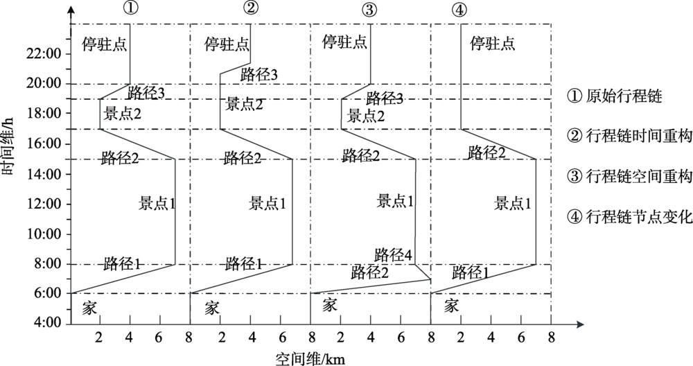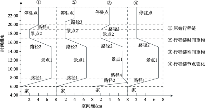 从时间、空间和结构3个层面进一步梳理旅 游行程链时空重构的变化特征。时间属性体现在:① 节点游览时间,灵活可变且具有最佳游览时长属性;② 道路交通时间,时间固定且可提前预估; ③ 餐饮、住宿等旅行辅助活动时间,一般指为满足游览过程所提供的辅助性配套活动。而空间属性则体现在节点与路段交替相连的空间连续性与方向性上。结构特征则体现在行程中停驻点数量和交通换乘组合方式上,当时间、空间和结构特征任意一者发生改变时,行程链即发生重构,3种重构形式可能独立发生,也可能同时发生(图2 )。以行程链“家-景点1-景点2-停驻点”为例,图中① 号为原始行程;② 号表述的是游客在景点2处游玩时间延长,但总体出行路径不变;③ 号表述的是游客前往景点1的出行路线有变,导致整体行程链长度增加;④ 号表述的是游客在行程中取消景点2的游玩,出行次数减少,行程链的时空特征也相应发生改变。