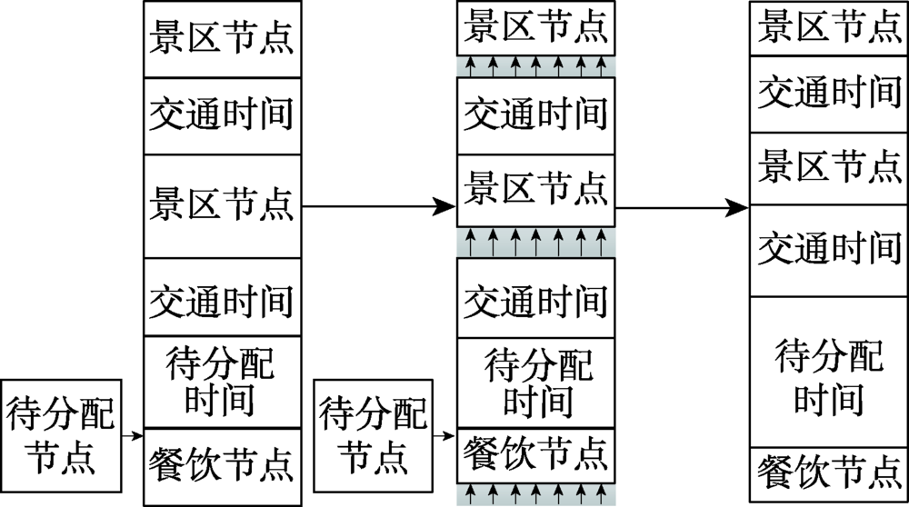 根据国家旅游局在旅游行业规范性文件中的指导要求,以及各旅行社在实际旅游实践过程中的具体经验,各旅游节点的游览时间一般可在原定规划时段上下20%区间内浮动。具体来说,对于景区、购物、娱乐等游览类节点,其游览时长一般是浮动可变的,在具体安排中首先需要判断该节点时长经最大压缩后能否排入日程时段;若无法安排,再考虑将半天段内节点游览时长(包括当前待排节点)进行整体压缩以覆盖当前节点,其次考虑对当日餐饮和住宿时长进行压缩之后能否安排,最后考虑不同节点间交通出行时间的安排。在节点顺序确定之后,算法提供游客对每日游览时段进行精细化分配。算法支撑游客根据需要对具体日程进行动态调整,通过合理分配不同节点游览时间的方式,满足游客定制化需求。首先扣除固定时长的节点,对包括景区、购物、娱乐、餐饮、住宿在内的浮动节点依次进行时段划分(图5 ),具体安排过程需注意以下关键条件:① 首先判断对该节点时长在不超过压缩限额的条件下能否排入当前半天时段(压缩时间保证在总时段20%为宜);② 若无法安排,再考虑跨越至之前的半天时段对浮动节点(包括当前待排节点)进行时间压缩;③ 若仍无法安排则考虑对餐饮与住宿时间进行适当压缩保证游览需求;④ 当出现以上条件均未满足的情况时,将该节点作为候选节点以供游客自主调整。