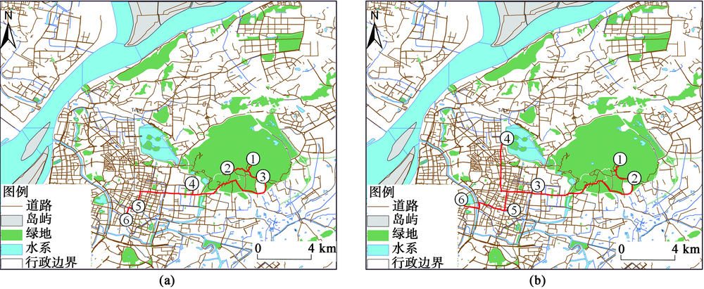实验选取中山陵为出行首位景点,综合考虑节点所处环境的空间拓扑关系,结合遗传算法与城市路网条件进行线路规划。表4 规划结果显示,在线路安排中考虑到中山陵、明孝陵与灵谷寺同属于钟山风景区,因而在明孝陵之后首先安排了灵谷寺景区,而并选择道路距离更近的南京博物院,从而保证了游览的连贯性(表4 );此外,图8 (b)侧规划结果显示,在考虑总统府、夫子庙与玄武湖3个景点游览顺序时,算法选择将总体道路距离最短作为规划依据,给出了优先玄武湖而后夫子庙的顺序安排,从而保证最大缩短路程距离,限度节省道路交通时间(表4 )。从线路顺序安排结果来看,算法顾及了节点拓扑关系与路网距离,规划结果相对合理。节点筛选顺序结果如图8 所示。