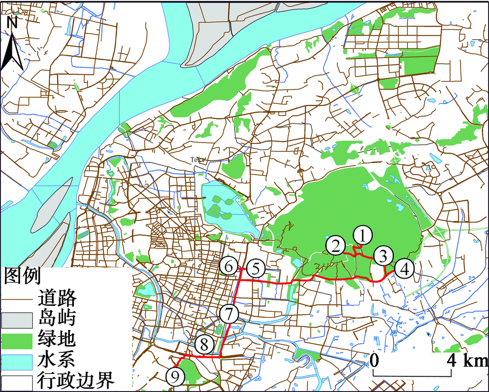 图8 顾及钟山风景区与整体游览路径空间拓扑关系的南京市旅游线路规划方案 注:数字为游览线路顺序。