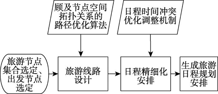 在梳理了游客出行模式的基础上,以城市为研究对象,提出行程链建模的具体流程(图3 )。考虑到该模型使用目标群体是城市旅游的自助散客,在使用模型前需要将出游起始点、游客人数、出游天数、出行交通方式、费用预算、特殊景点偏好等条件进行预设。具体来说,首先在顾及节点空间拓扑关系条件下,依据城市路网规则与道路状况开展的旅游线路设计;在此基础上,以分钟为基本时间单元对每日各项活动内容进行精细化的日程安排。此外,针对日程规划过程中可能出现的时空冲突情况,模型相应提出了时间动态调整与空间线路优化等应对机制,以保障规划结果的合理性与可操作性。