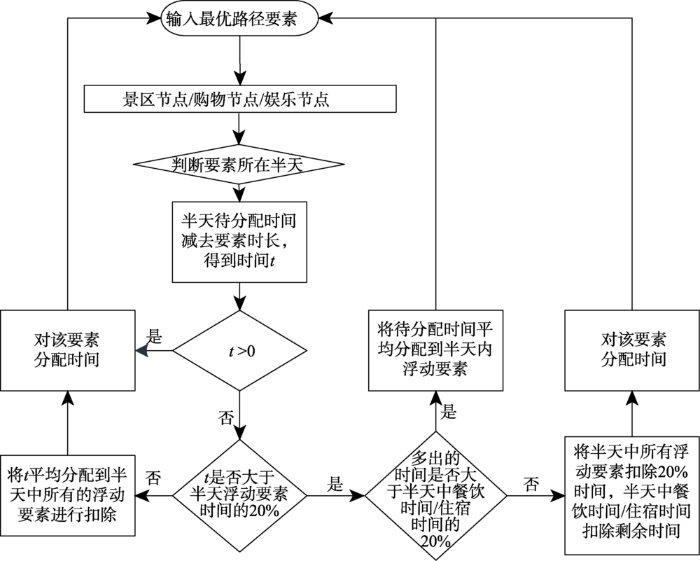 算法在考虑节点间空间拓扑关系与路网组成结构的基础上,首先进行线路空间规划,进而根据不同类型节点时间属性进行具体日程的分时段安排,满足每日游览时间的充分利用,最终生成时空统一且日程安排精细的行程规划方案。