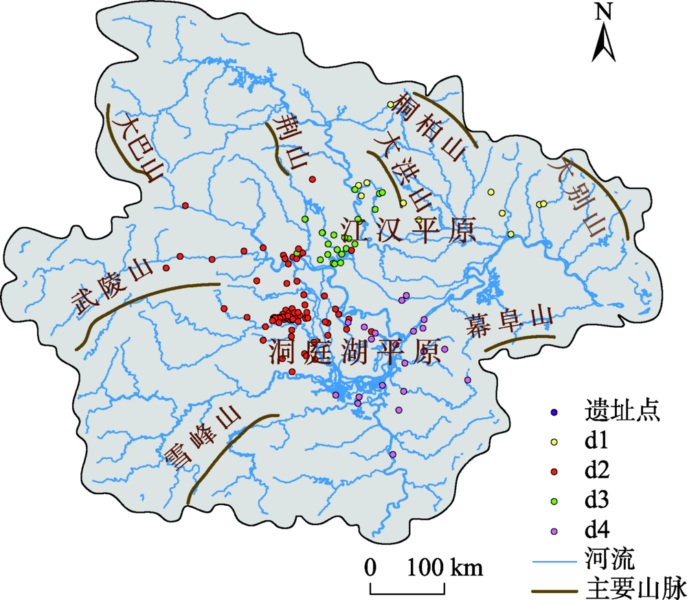 (1)大溪文化时期聚落遗址共聚类成4个聚落群,以d1-d4表示。聚落群d1位于江汉平原北部与大别山、桐柏山和大洪山交界处;聚落群d2位于洞庭湖西部丘陵地区;聚落群d3位于江汉平原西部;聚落群d4则环绕在洞庭湖的周围。