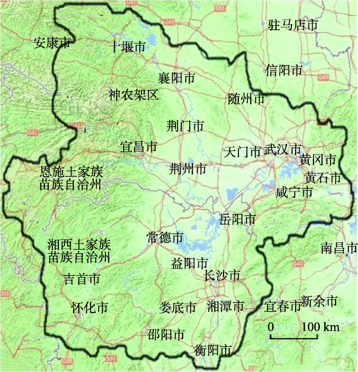 长江中游地区(26°56'N-33°34'N, 108°11'E-116°15'E)地处湖北、湖南两省,西有大巴山、巫山、武陵山、雪峰山屏障,东有桐柏山、大别山、幕阜山环伺。中间为两湖平原(江汉平原和洞庭湖平原),其间河网密布,湖群星罗(图1)。研究区内包括丘陵、平原、山地、河谷等多个地貌类型,为研究提供了空间差异性,利于分析与对比。