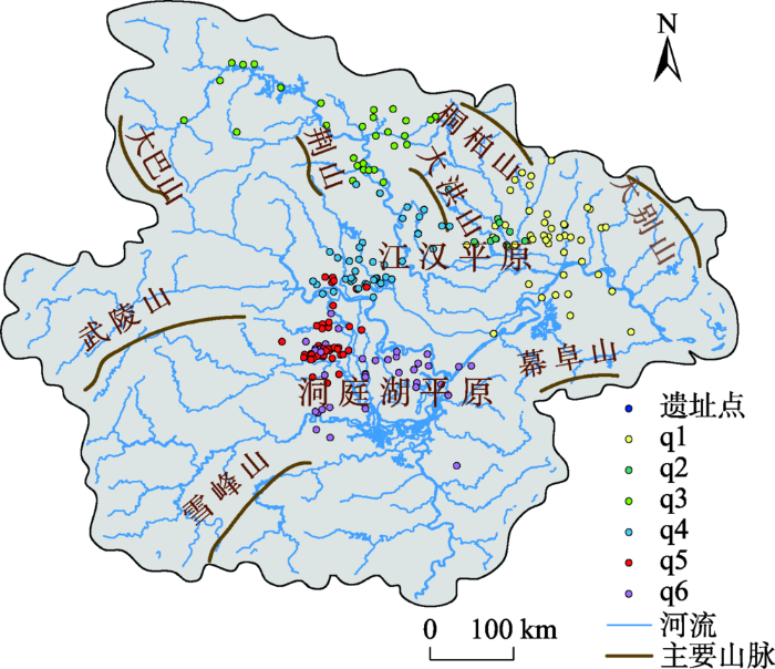 (2)屈家岭文化时期聚落遗址共划分为6个聚落群,以q1-q6表示。聚落群q1分布在江汉平原东北部与大别山交界处;聚落群q2分布范围较小,分布在聚落群q1西部,与之相接;聚落群q3位于汉水中游的河谷地;聚落群q4、q5分别分布于江汉平原西部和洞庭湖西部的丘陵地区;聚落群q6分布在洞庭湖平原和江汉平原的相接处。
