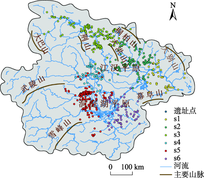 (3)石家河时期聚落遗址共划分为6个聚落群,以s1-s6表示。此时期是新石器时代发展的鼎盛时期,聚落遗址数据剧增,范围比屈家岭时期更加广泛。聚落群s1分布于江汉平原与大别山、幕阜山交界处。聚落群s2分布于江汉平原北部与大别山交界处,相较于屈家岭时期,此处的聚落遗址增加并逐渐向江汉平原腹部深入。聚落群s3分布于汉水中游的河谷两岸。聚落群s4分布于江汉平原西部地区,较屈家岭时期聚落群范围略有收缩。聚落群s5和s6分别位于洞庭湖周边东西侧。