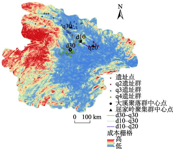 (2)位于汉水以东、大别山以西、长江以北、大洪山以南的丘陵岗地(q2聚落群),多为平坦的岗地平原地貌,又有众多小河流穿插其间,加之当时高温多雨的气候为此地区的农业生产提供了充足的条件,具备了人类生存的地理条件,故聚落群d1沿着大洪山与江汉平原交界处的d10-q20路线向聚落群q2迁移。