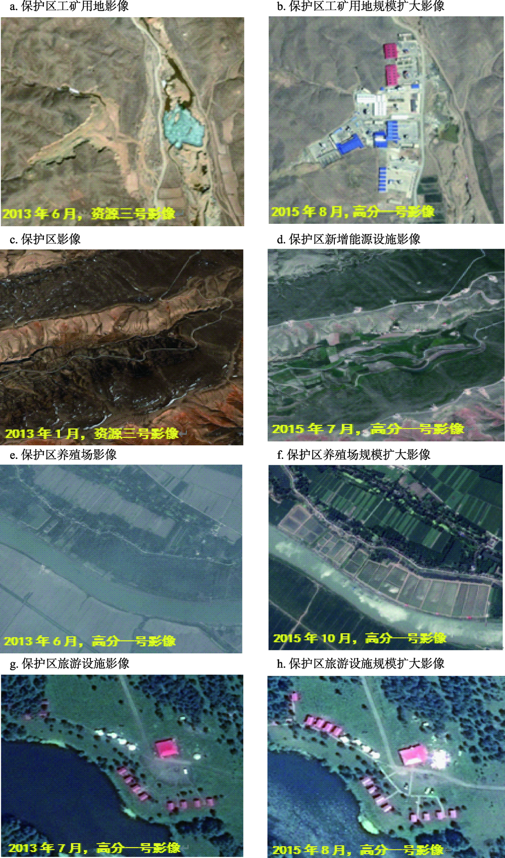 图3 2013—2015年保护区部分新增人类活动遥感影像 注:影像来源于资源三号卫星和高分一号卫星影像。 |