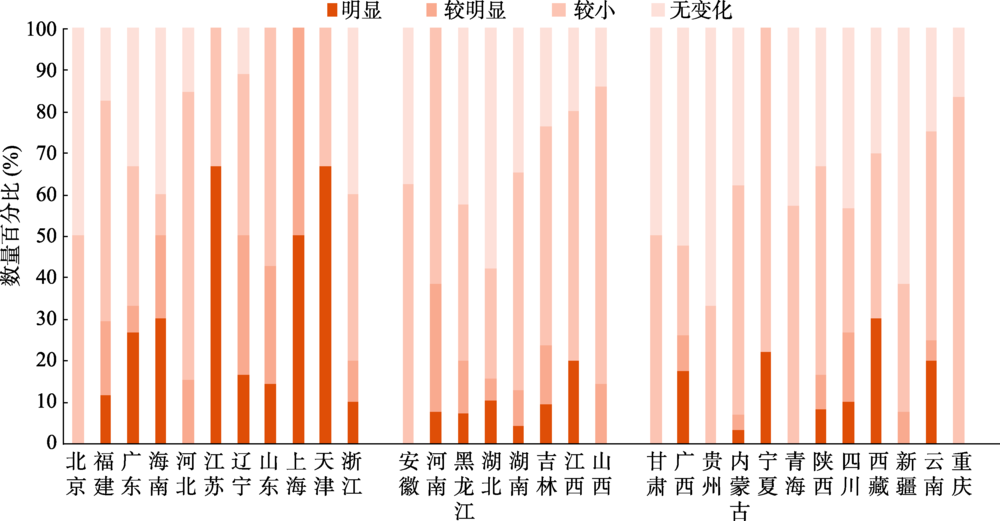 | Fig. 4 The number ratio of human activity change intensity in national nature reserves in the east, central and western China from 2013 to 2015 |