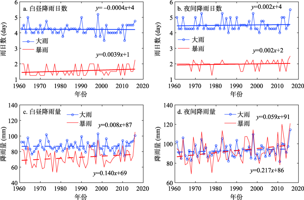 Fig. 4 The changes of daytime and nighttime extremes precipitation (including heavy rain and torrential rain) in China from 1961 to 2016; (a) and (b) are frequencies of daytime and nighttime extreme precipitation, respectively; (c) and (d) are amount of daytime and nighttime extreme precipitation, respectively |